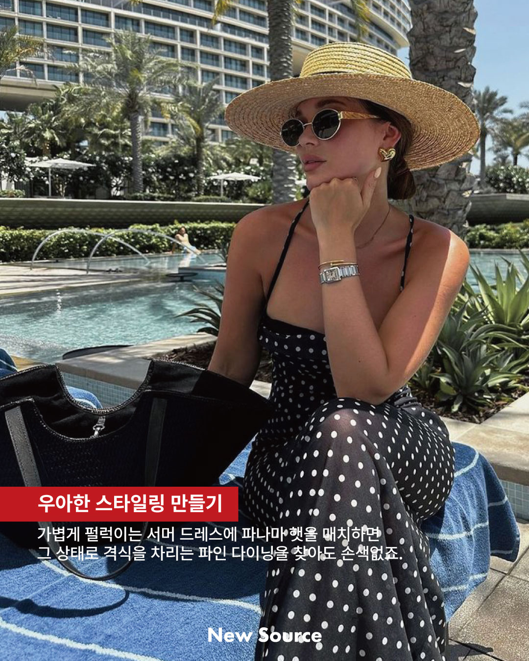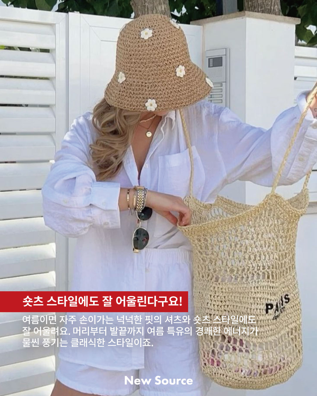 여름이면 자주 손이가는 넉넉한 핏의 셔츠와 숏츠 스타일에도 얼마나 잘 어울린다구요! 머리부터 발끝까지 여름 특유의 경쾌한 에너지가 물씬 풍기는 클래식한 스타일이죠. 롱 드레스와 파나마 햇, 이 두 조합은 실패 확률 제로에 가까워요. 스타일링에 시간과 고민을 들이고 싶지 않다면 시원한 롱 드레스에 모자만으로도 완벽하게 드레스-업 할 수 있어요.